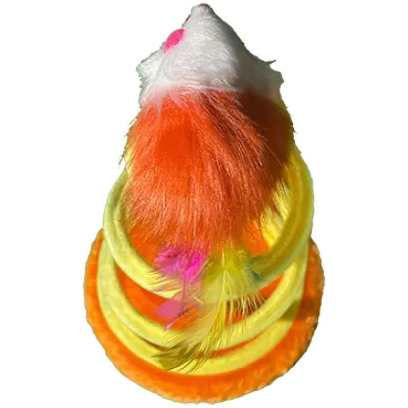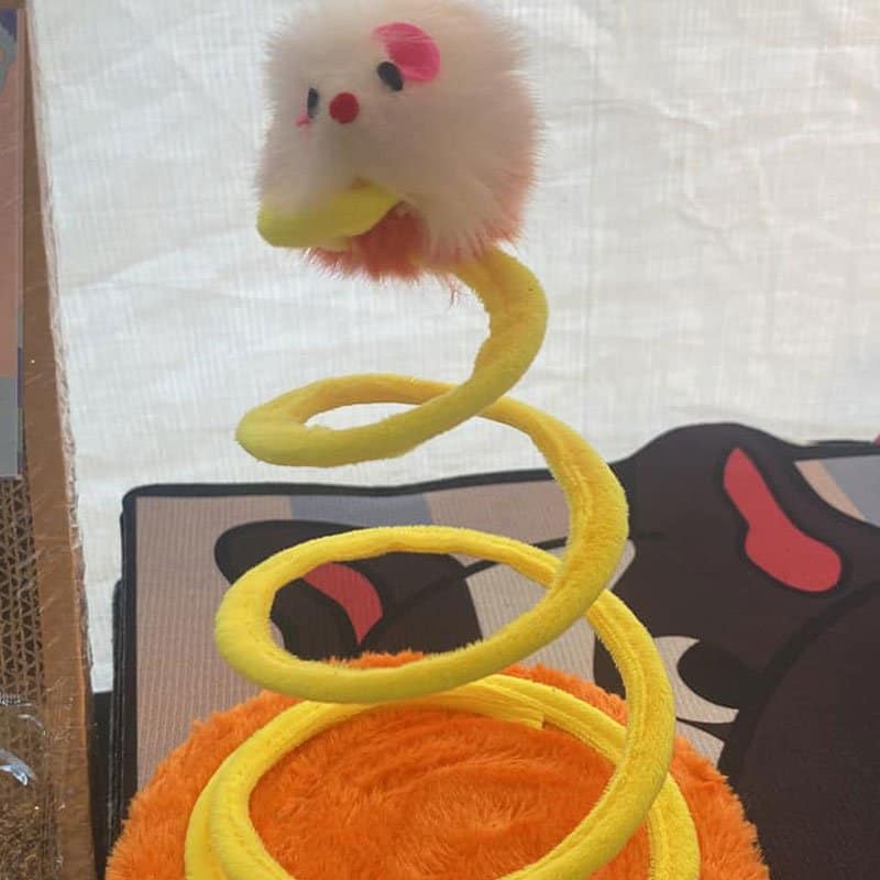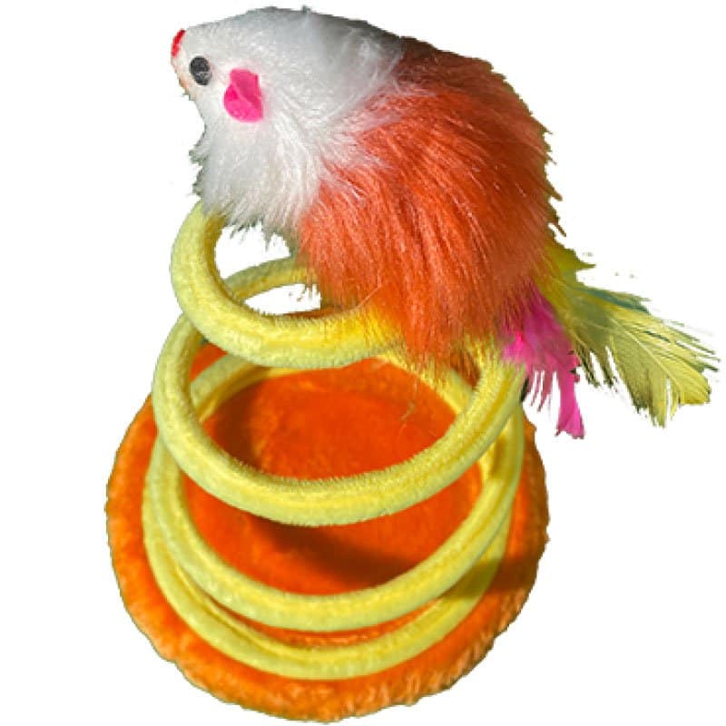 Ratón de peluche con plumas sobre un resorte recubierto en tela suave sobre una base para que tu michi le pegue cuántas veces quiera y se entretenga.